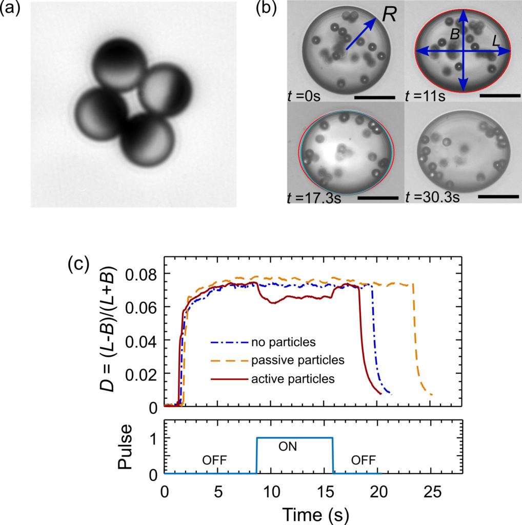Figure: Active particle interaction with deformable interfaces. (a) Janus particles with a titanium coating on the half side of the particles. (b) Active Janus particles inducing a drop deformation reduction, resulting in a higher effective surface tension of the drop. Laser is on at 17.3s where particles move towards the interface quickly. (c) The drop deformations under laser illumination off or on. The Taylor parameter D is decreased when the laser is on, which means the drop deforms less.